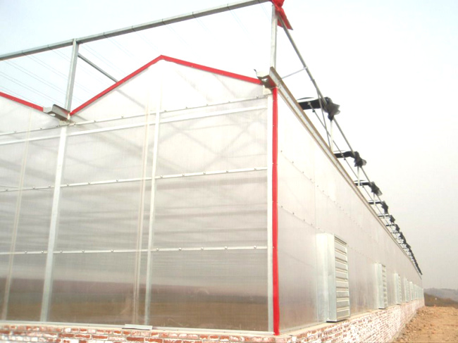 阳光板温室多为文洛型(也可以采用圆拱形),多采用一跨多顶,外形现代,结构稳定,形式美观大方,视觉流畅,保温性能卓越,透光率适中,多雨槽,大跨度,排水量大,抗风能力强,适合于风力与雨量较大地区。阳光板温室,具有透光度好,热传导系数低,由于阳光板分量轻,寿命长,拉伸强度大,通过简单的钢骨结构就能满足抗风、抗雪的要求,并且寿命长,美观大方,减少重复建设及投资,是替代原始的塑料薄膜温室与玻璃温室的首选产品。